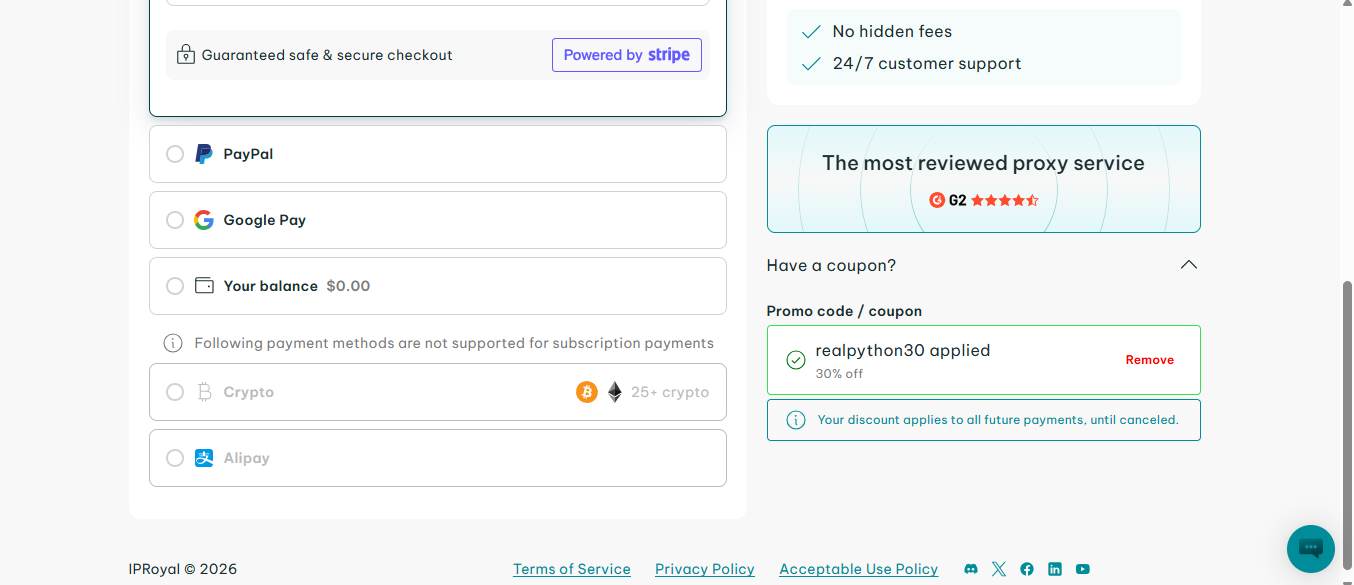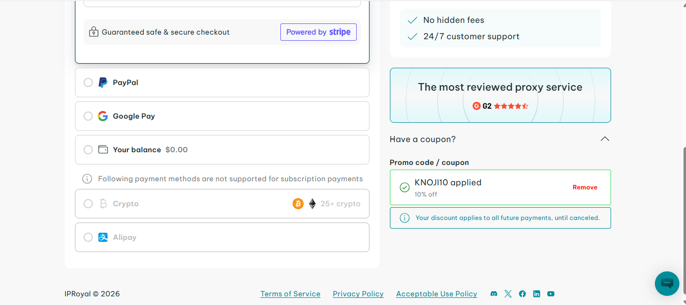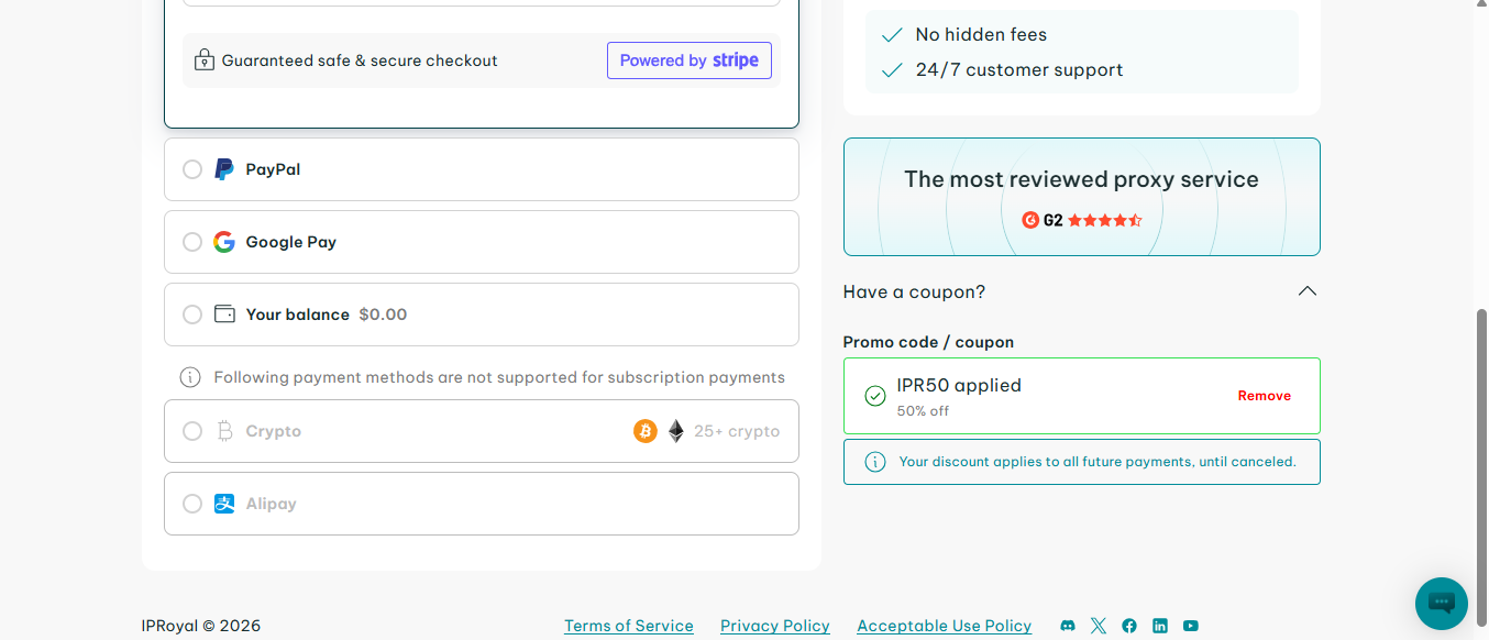 IPRoyal accepts major credit cards (Visa, MasterCard, Amex, Discover), PayPal, various European payment methods (Bancontact, EPS, iDeal), and 90+ cryptocurrencies including Bitcoin and Ethereum. All payment methods are compatible with promotional codes and discount offers.